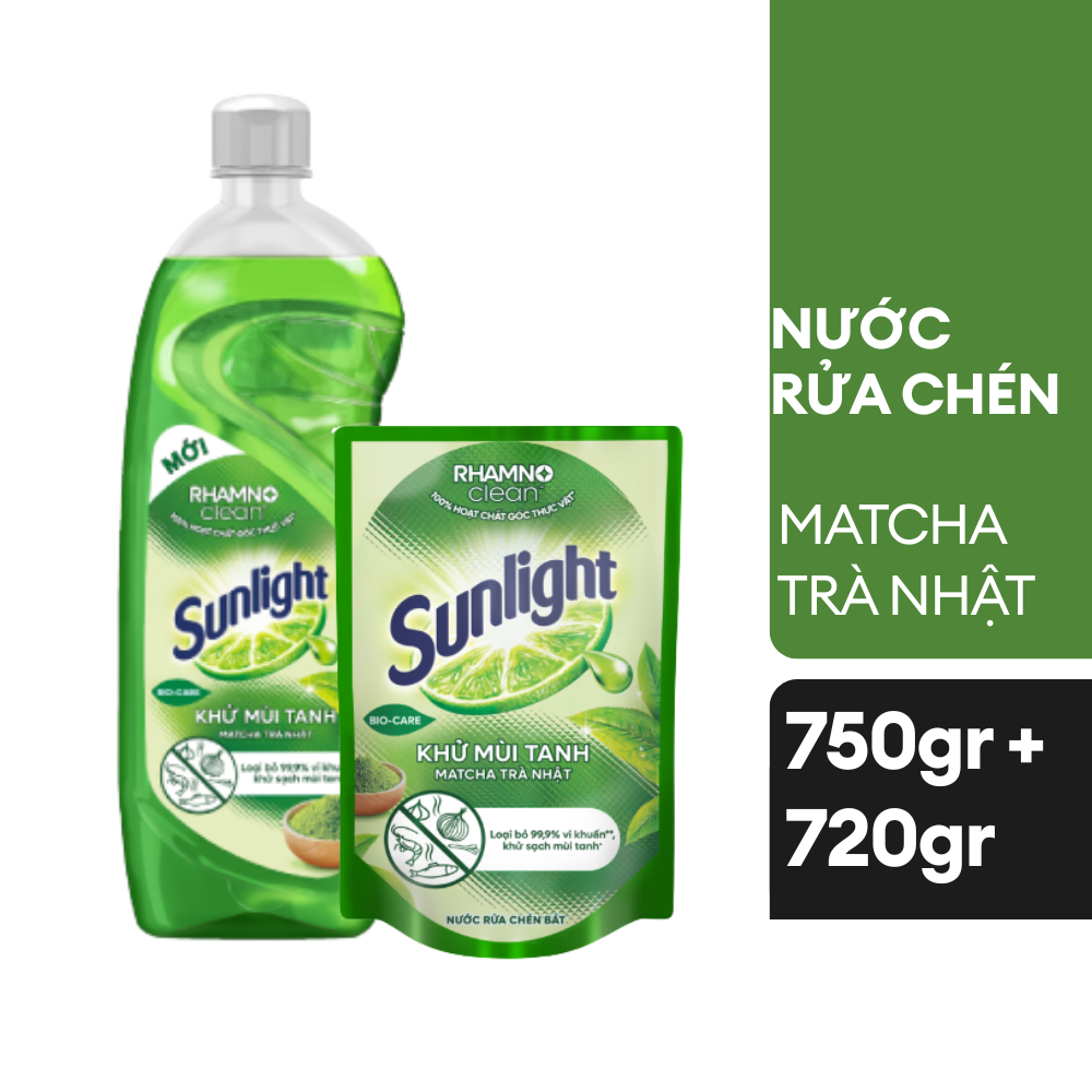 Combo Nước rửa chén Sunlight Khử mùi tanh Matcha Trà nhật 750g + Túi 720g