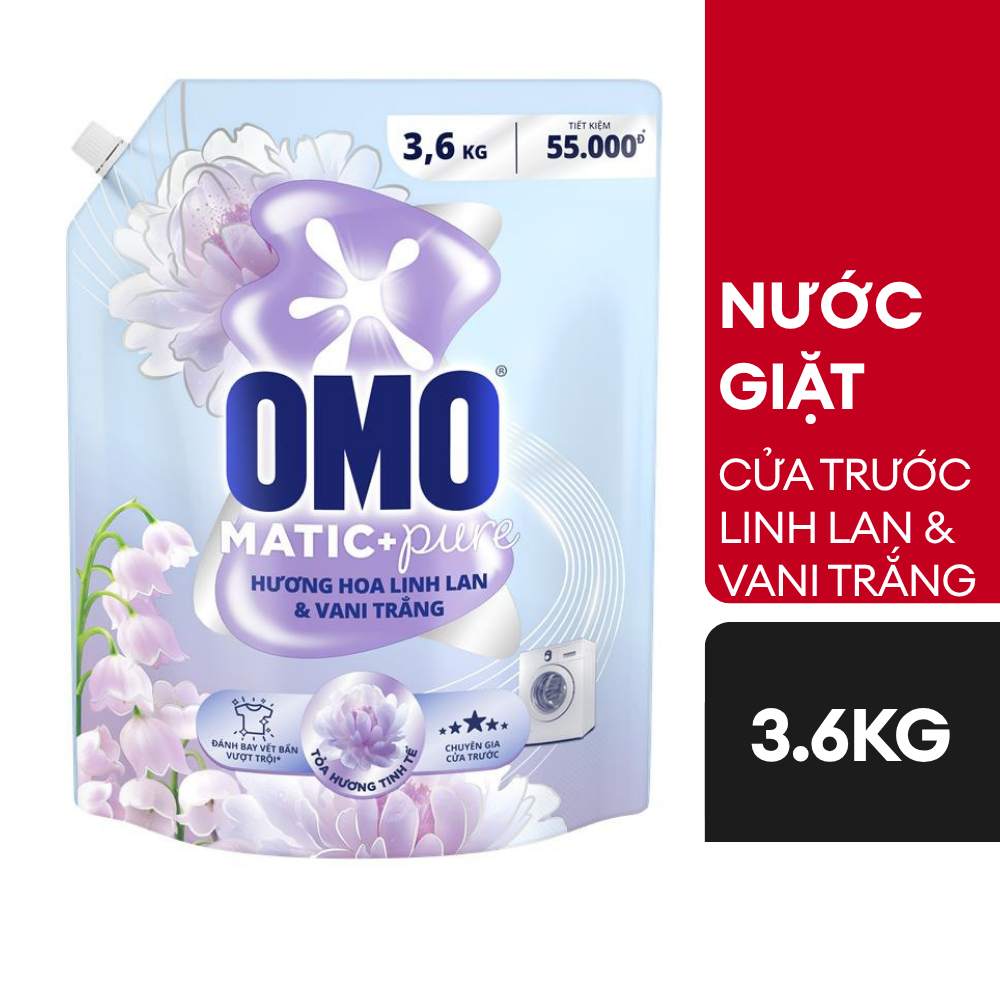 - Đánh bay vết bẩn vượt trội* Công thức ưu việt giúp loại bỏ những vết bẩn từ thức ăn, bùn đất ngay từ lần giặt đầu tiên** mà không để lại cặn nước giặt trên quần áo. 2. Lưu Hương Thanh Nhã Dài Lâu. Lấy cảm hứng từ hương thơm của hoa linh lan tinh khôi hòa quyện trên nền hương ngọt ngào từ vani trắng, OMO Matic Pure mang lại cảm giác nữ tính và thanh lịch cho áo quần.