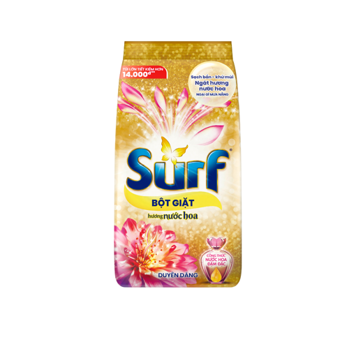Bột giặt Surf hương nước hoa có tác dụng đánh bay những vết bẩn cứng đầu khó giặt. Với ưu điểm thấm sâu, nhanh vào từng thớ vải có tác dụng làm sạch vết bẩn một cách hiệu quả giúp cho quần áo của gia định bạn luôn được trắng sáng như mới. Sản phẩm là sự kết hợp hoàn hảo giữa sức mạnh giặt tẩy của Surf với hương thơm nhẹ nhàng, tươi mát từ nước xả vải giúp cho quần áo của bạn luôn được trắng sạch như mới và lưu lại hương thơm lâu dài.