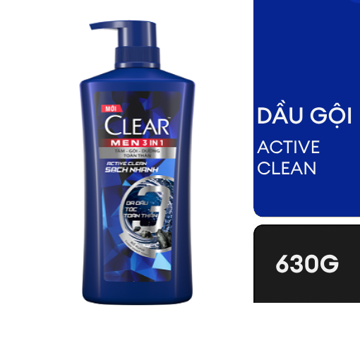 Dầu Tắm Gội Clear Men 3 Trong 1 - Active Clean Sạch Sâu (630g)Là dòng sản phẩm đầu tiên của CLEAR Men mang đến giải pháp tắm gội toàn diện cho nam giới với 3 sức mạnh bất bại: